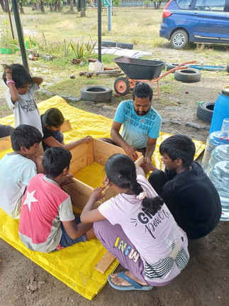 The teens designed and created a mini space for experiments with nature. The first session on day 1 was to create a design for the space in a way it is functional. They came up with few designs and finalised a design with boxes on 2 sides and in the middle.