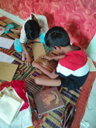 The art session was a culmination of 2 concepts – Sound and community. Participants were asked to listen to a sound – shirt hanger hitting a wall with a rope connected to their ears and asked to interpret the sound through a drawing. From their own drawings, each participant chose a favorite part and used this part of the art to write a food, place, person and flower which resembled the art. The paper was circulated to the next person and the second participant also identified a food, place, person and flower which resembled the art. The paper was again circulated in the circle to the next participant and participants were asked to create a story using the 2 set of inputs. The paper was again circulated, the next person was asked to re-write the story with changing letters with imagination of sounds – like if the word is JUMP then the participants need to use a font to represent the sound and emotions.